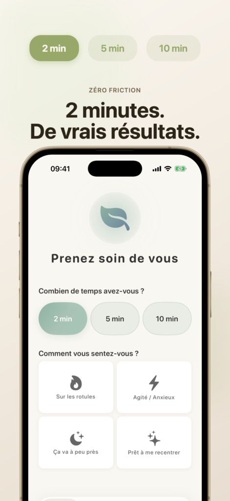 Et là, je me suis dit un truc : c’est quand même absurde. J’ai 5 minutes devant moi. Peut-être 10 si personne ne se réveille. Je suis sur les rotules, mais aucune application de bien-être ne part de ce constat. Elles partent toutes du principe que j’ai du temps, du calme et de la motivation.