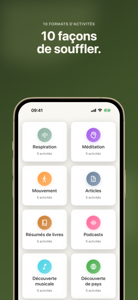 Ce n’est pas que de la méditation. Selon ton état, ça peut être de la respiration guidée, du mouvement doux, un podcast à écouter, ou un micro-apprentissage. L’idée est que quand tu es épuisé à 22h, tu n’as pas besoin du même exercice que quand tu es speed entre deux réunions à 14h.